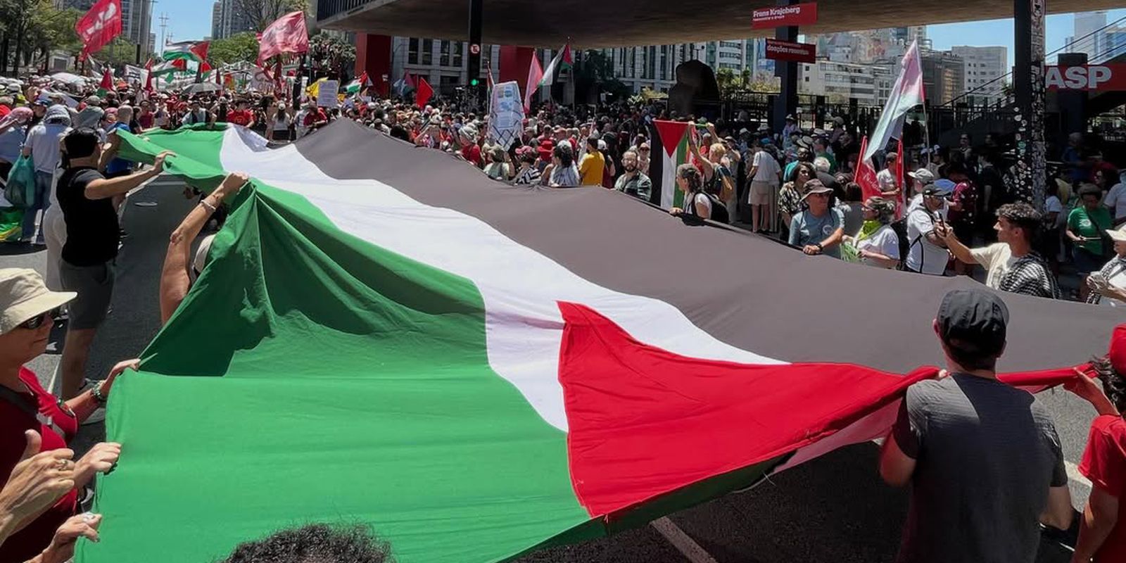 Em mais um ato pró-palestina no centro de São Paulo, alguns milhares de manifestantes demonstraram solidariedade aos ativistas presos durante nesta semana por Israel enquanto tentavam romper o bloqueio naval imposto à região da Faixa de Gaza.