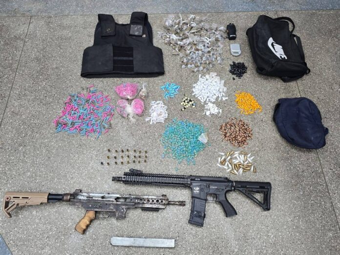 Com os suspeitos foram apreendidos uma submetralhadora calibre 9mm, um simulacro de fuzil M4, 22 munições de 9mm, um colete balístico, além de drogas: 145 porções de maconha, 318 pinos de crack, 435 pinos de cocaína e 396 pinos de K9. Também foram recolhidos um rádio comunicador, um celular e duas sacolas.