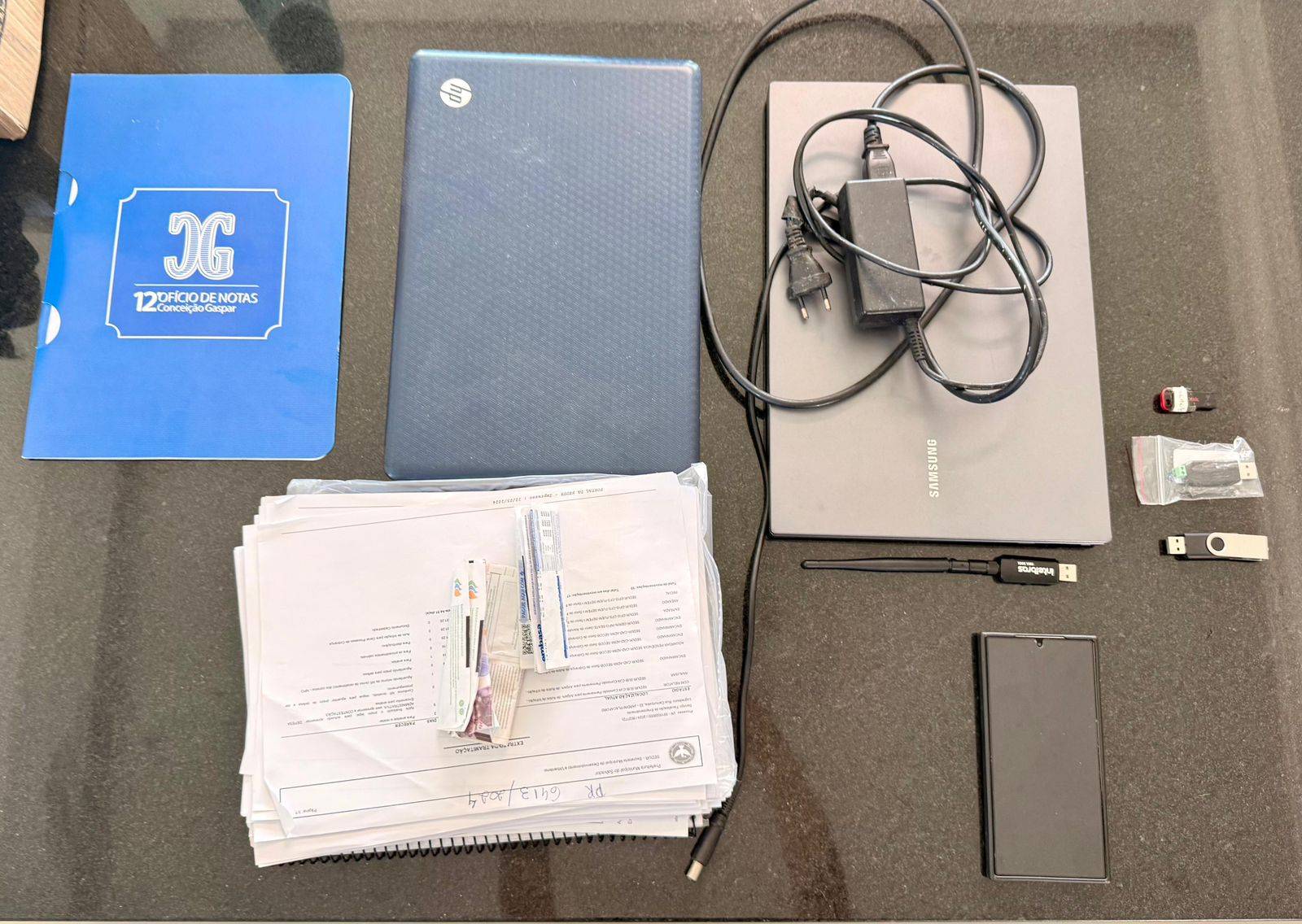 Durante o cumprimento do mandado, os policiais — acompanhados pela esposa do investigado — apreenderam um celular, dois notebooks, quatro dispositivos de armazenamento digital (pendrives) e diversos documentos, que serão submetidos à análise técnica.