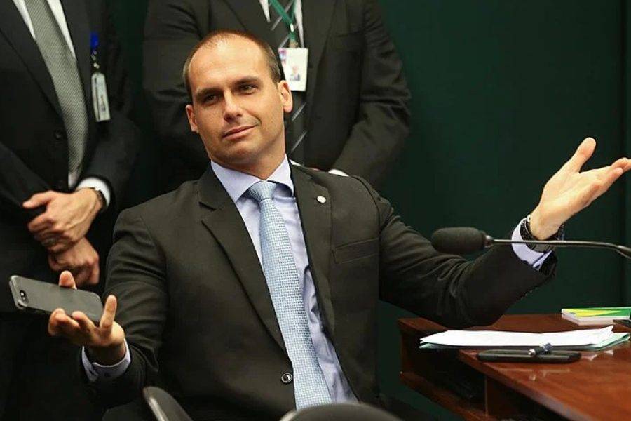 Eduardo Bolsonaro deixou o país em fevereiro e está nos Estados Unidos. Ele pediu licença de 120 dias do mandato, mas, desde o fim do prazo, em 20 de julho, não comparece às sessões da Câmara, podendo ser alvo de processo de cassação por faltas.